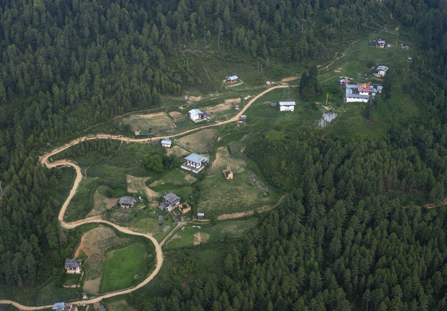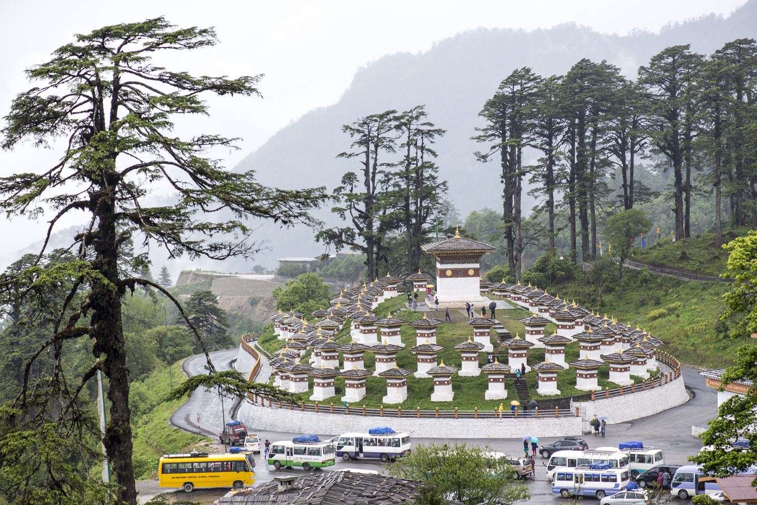 Thimput elhagyva meredeken kapaszkodunk felfelé a fenyő- és cipruserdők között. A Dochula-hágó (3100 m) felé közeledve a fákon megjelennek a zuzmók is. A hágóban épült 108 csortentől tiszta időben csodálatos kilátás nyílik a Himalája vonulatára. Miután kigyönyörködtük magunkat, a köderdő közepén álló étteremben megebédelünk, majd az éles hajtűkanyarokkal tarkított úton a Punakha-völgybe ereszkedünk le. Az 1200 méter magasan fekvő, trópusi éghajlatú Punakha-völgy Bhután egyik legfestőibb úti célja.