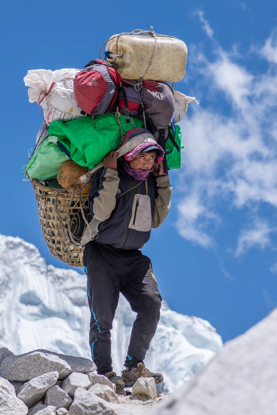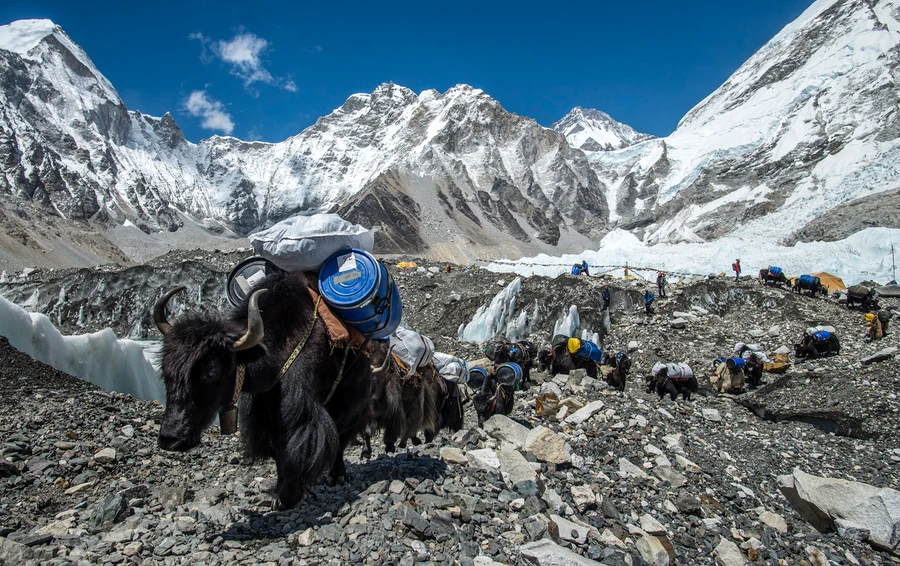 Kb. 500 méter erejéig megint feltűnnek a növények, de aztán jön a jó öreg kő kő hátán talaj. Elérünk egy lapájszerű valamihez, ahol összeér a két oldali út és innentől menetelünk együtt mindenkivel, aki a BC-be tart, vagy onnan jön. Trekkingelők keverednek az expedícióknak szállító jak csordákkal, valamint porterekkel. Néha egészen extrém szállítmányokat látunk az ember vagy az állat hátán. Tábori tűzhely, ajtó, lodge fal, több 10 liter víz hordóban stb. Himalájai értelemben komoly forgalom van ezen a relatíve széles úton.